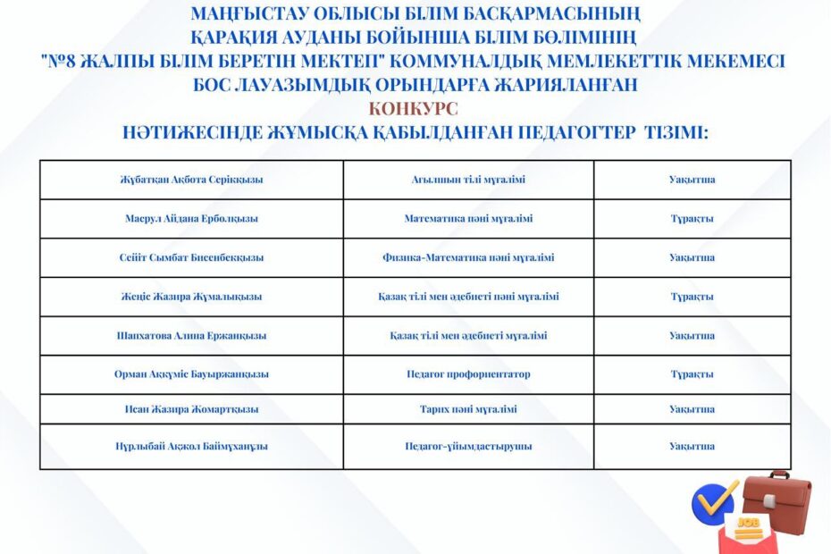 ПЕДАГОГТЕРДІ ЖҰМЫСҚА ҚАБЫЛДАУ БОЙЫНША ӨТКІЗІЛГЕН КОНКУРС НӘТИЖЕСІ 19.08.2025ж. Маңғыстау облысының…Тамыз 19, 2025